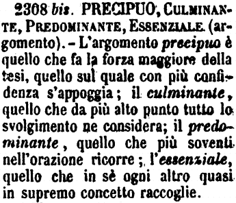 Precipuo, Culminante, Predominante, Essenziale (argomento) - L'argomento precipuo è quello che fa la forza maggiore della tesi, quello sul quale con più confidenza s'appoggia; il culminante, quello che da più alto punto tutto lo svolgimento ne considera; il predominante, quello che più soventi nell'orazione ricorre; l'essenziale, quello che in sè ogni altro quasi in supremo concetto raccoglie. [immagine]