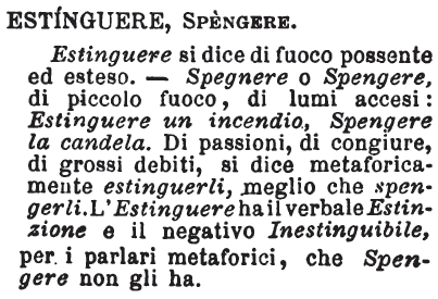 Estinguere, Spengere - Estinguere si dice di fuoco possente ed esteso. - Spegnere o Spengere, di piccolo fuoco, di lumi accesi: Estinguere un incendio, Spengere la candela. Di passioni, di congiure, di grossi debiti, si dice metaforicamente estinguerli, meglio che spengerli. L'Estinguere ha il verbale Estinzione e il negativo Inestinguibile, per i parlari metaforici, che Spengere non gli ha. [immagine]