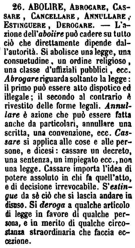 Abolire, Abrogare, Cassare, Cancellare, Annullare, Estinguere, Derogare - L'azione dell'abolire può cadere su tutto ciò che direttamente dipende dall'autorità. Si abolisce una legge, una consuetudine, un ordine religioso, una classe d'uffiziali pubblici, ecc. Abrogare riguarda soltanto la legge: il primo può essere atto dispotico ed illegale; il secondo al contrario è rivestito delle forme legali. Annullare è azione che può essere fatta anche da particolari, annullare una scritta, una convenzione, ecc. Cassare si applica alle cose e alle persone, e dicesi: cassare un decreto, una sentenza, un impiegato ecc., non una legge. Cassare importa l'idea di potere assoluto in chi fa quell'atto, e di decisione irrevocabile. S'estingue da sè ciò che si lascia andare in disuso. Si deroga a qualche articolo di legge in favore di qualche persona, e in merito di qualche circostanza straordinaria che faccia eccezione. [immagine]