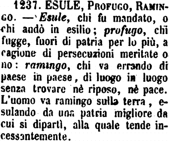 Esule, Profugo, Ramingo - Esule, chi fu mandato, o chi andò in esilio; profugo, chi fugge, fuori di patria per lo più, a cagione di persecuzioni meritate o no: ramingo, chi va errando di paese in paese, di luogo in luogo senza trovare nè riposo, nè pace. L'uomo va ramingo sulla terra, esulando da una patria migliore da cui si dipartì, alla quale tende incessantemente. [immagine]