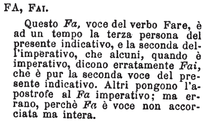 Fa, Fai - Questo Fa, voce del verbo Fare, è ad un tempo la terza persona del presente indicativo, e la seconda dell'imperativo, che alcuni, quando è imperativo, dicono erratamente Fai, che è pur la seconda voce del presente indicativo. Altri pongono l'apostrofe al Fa imperativo; ma errano, perché Fa è voce non accorciata ma intera. [immagine]