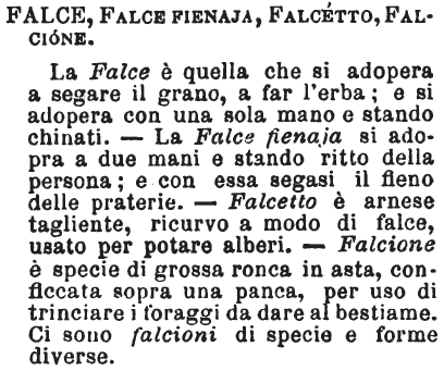 Falce, Falce fienaja, Falcetto, Falcione - La Falce è quella che si adopera a segare il grano, a far l'erba; e si adopera con una sola mano e stando chinati. - La Falce fienaja si adopra a due mani e stando ritto della persona; e con essa segasi il fieno delle praterie. - Falcetto è arnese tagliente, ricurvo a modo di falce, usato per potare alberi. - Falcione è specie di grossa ronca in asta, conficcata sopra una panca, per uso di trinciare i foraggi da dare al bestiame. Ci sono falcioni di specie e forme diverse. [immagine]