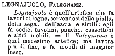 | Legnajuolo, Falegname - Legnajuolo è quell'artefice che fa lavori di legno, servendosi della pialla, della sega, dell'ascia e simili: egli fa sedie, tavolini, panche, cassettoni e altri mobili. - Il Falegname è quel medesimo artefice; ma lavora più di fine, e fa mobili di maggior lusso. [immagine] |