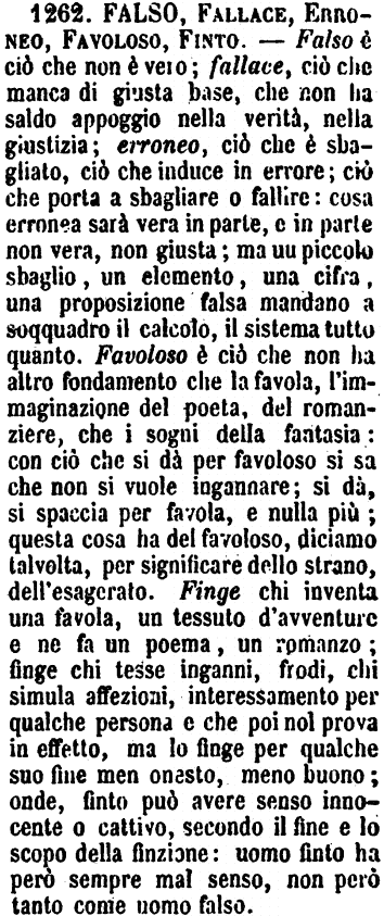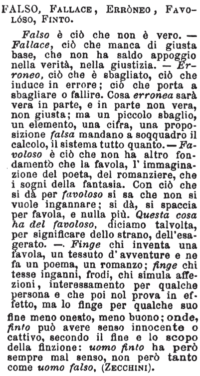 | Falso, Fallace, Erroneo, Favoloso, Finto - Falso è ciò che non è vero; fallace, ciò che manca di giusta base, che non ha saldo appoggio nella verità, nella giustizia; erroneo, ciò che è sbagliato, ciò che induce in errore; ciò che porta a sbagliare o fallire: cosa erronea sarà vera in parte, e in parte non vera, non giusta; ma un piccolo sbaglio, un elemento, una cifra, una proposizione falsa mandano a soqquadro il calcolo, il sistema tutto quanto. Favoloso è ciò che non ha altro fondamento che la favola, l'immaginazione del poeta, del romanziere, che i sogni della fantasia: con ciò che si dà per favoloso si sa che non si vuole ingannare; si dà, si spaccia per favola, e nulla più; questa cosa ha del favoloso, diciamo talvolta, per significare dello strano, dell'esagerato. Finge chi inventa una favola, un tessuto d'avventure e ne fa un poema, un romanzo; finge chi tesse inganni, frodi, chi simula affezioni, interessamento per qualche persona e che poi nol prova in effetto, ma lo finge per qualche suo fine men onesto, meno buono; onde, finto può avere senso innocente o cattivo, secondo il fine e lo scopo della finzione: uomo finto ha però sempre mal senso, non però tanto come uomo falso. [immagine] |