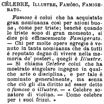 | Celebre, Illustre, Famoso, Famigerato - Famoso è colui che ha acquistato gran nominanza così per azioni buone, come per triste; benchè quando le triste sono di gran momento, si dice più efficacemente Famigerato. - Chi per molte opere egregie è venuto in tanta nominanza che da tutti è reputato degno di vivere nella memoria de' posteri, quegli è Illustre. - Si chiama Celebre colui che ha mostrato singolare ingegno in qualche arte o disciplina, e per tale è nominato generalmente, ma senza che ciò gli dia diritto ad esser detto o famoso o illustre. - «Celebre sonatore di violino. - Uomo celebre per i suoi frizzi.» [immagine] |
