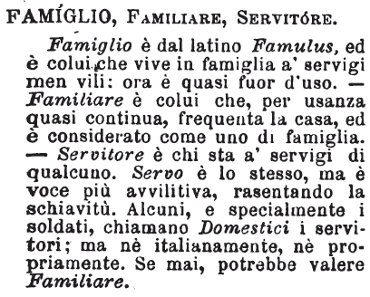 | Famiglio, Familiare, Servitore - Famiglio è dal latino Famulus, ed è colui che vive in famiglia a' servigi men vili: ora è quasi fuor d'uso.-Familiare è colui che, per usanza quasi continua, frequenta la casa, ed è considerato come uno di famiglia.-Servitore è chi sta a' servigi di qualcuno. Servo è lo stesso, ma è voce più avvilitiva, rasentando la schiavitù. Alcuni, e specialmente i soldati, chiamano Domestici i servitori; ma nè italianamente, nè propriamente. Se mai, potrebbe valere Familiare. [immagine] |