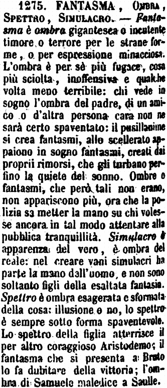 Fantasma, Ombra, Spettro - Fantasma è ombra gigantesca o incutente timore o terrore per le strane forme, o per atti minacciosi. - L'Ombra è per sè più fugace, cosa più sciolta, inoffensiva e qualche volta meno terribile. Chi vede in sogno l'ombra del padre, di un amico o d'altra persona cara, non ne sarà al certo spaventato: il pusillanime si crea fantasmi; allo scellerato appajono in sogno fantasmi, creati dai proprii rimorsi, che gli turbano perfino la quiete del sonno. - Spettro è ombra esagerata e sformata della cosa: illusione o no, lo spettro è sempre sotto forma spaventevole. Lo spettro della figlia atterrisce il per altro coraggioso Aristodemo: il fantasma che si presenta a Bruto lo fa dubitare della vittoria; l'ombra di Samuele maledice a Saulle. (Zecchini). [immagine]