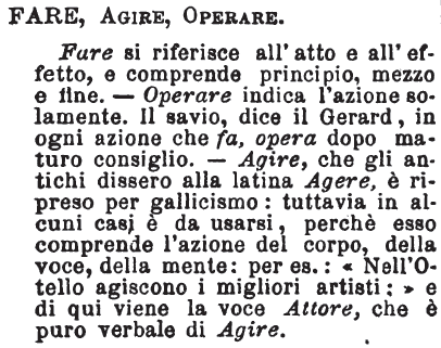 | Fare, Agire, Operare - Fare si riferisce all'atto e all'effetto, comprende principio, mezzo e fine. - Operare indica l'azione solamente. Il savio, dice il Gerard, in ogni azione che fa, opera dopo maturo consiglio. - Agire, che gli antichi dissero alla latina Agere, è ripreso per gallicismo: tuttavia in alcuni casi è da usarsi, perchè esso comprende l'azione del corpo, della voce, della mente: per es.: «Nell'Otello agiscono i migliori artisti:» e di qui viene la voce Attore, che è puro verbale di Agire. [immagine] |