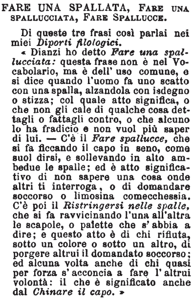 «Dianzi ho detto Fare una spallucciata: questa frase non è nel Vocabolario, ma è dell'uso comune, e si dice quando l'uomo fa uno scatto con una spalla, alzandola con isdegno o stizza; col quale atto significa, o che non gli cale di qualche cosa dettagli o fattagli contro, o che alcuno lo ha fradicio e non vuol più saper di lui. - C'è il Fare spallucce, che si fa ficcando il capo in seno, come suol dirsi, e sollevando in alto ambedue le spalle; ed è atto significativo di non sapere una cosa onde altri ti interroga, o di domandare soccorso o limosina comecchessia. C'è poi il Ristringersi nelle spalle, che si fa ravvicinando l'una all'altra le scapole, o palette che s'abbia a dire; e questo atto è di chi rifiuta, sotto un colore o sotto un altro, di porgere altrui il domandato soccorso; ed alcuna volta anche di chi quasi per forza s'acconcia a fare l'altrui volontà: il che è significato anche dal Chinare il capo.» [immagine] |