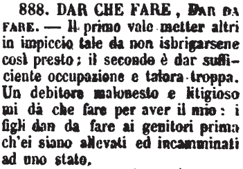 | Dar che fare, Dar da fare - Il primo vale metter altri in impiccio tale da non isbrigarsene così presto; il secondo è dar sufficiente occupazione e talora troppa. Un debitore malonesto e litigioso mi dà che fare per aver il mio: i figli dan da fare ai genitori prima ch'ei siano allevati ed incamminati ad uno stato. [immagine] |