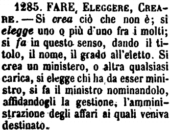 | Fare, Eleggere, Creare - Si crea ciò che non è; si elegge uno o più d'uno fra i molti; si fa in questo senso, dando il titolo, il nome, il grado all'eletto. Si crea un ministero, o altra qualsiasi carica, si elegge chi ha da esser ministro, si fa il ministro nominandolo, affidandogli la gestione, l'amministrazione degli affari ai quali veniva destinato. [immagine] |