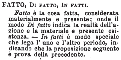 Fatto, Di fatto, In fatti - Fatto è la cosa fatta, considerata materialmente e presente; onde il modo Di fatto indica la realtà dell'azione e la materiale e presente esistenza. - In fatti è modo speciale che lega l'uno e l'altro periodo, indicando che la proposizione seguente è prova della precedente. [immagine]