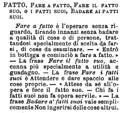 Fatto, Fare a fatto, Fare il fatto suo, o i fatti suoi, Badare ai fatti suoi - Fare a fatto è l'operare senza riguardo, tirando innanzi senza badare a qualità di cose o di persone, trattandosi specialmente di scelta da farsi, di cose da esaminare. - «Entrò in bottega e cominciò a fare a fatto.» - La frase Fare il fatto suo, accenna più specialmente a utilità e guadagno. - La frase Fare i fatti suoi è Attendere e dare spaccio alle cose proprie. - «Attese da sè all'opera e fece il fatto suo. - Chi fa i fatti suoi non fa opera servile.» - La frase Badare a' fatti suoi vale semplicemente Non ingerirsi delle cose altrui. [immagine]