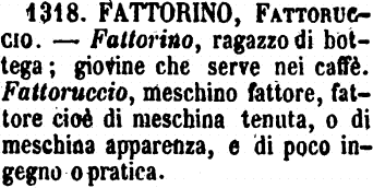 | Fattorino, Fattoruccio - Fattorino, ragazzo di bottega; giovine che serve nei caffè. Fattoruccio, meschino fattore, fattore cioè di meschina tenuta, o di meschina apparenza, e di poco ingegno o pratica. [immagine] |