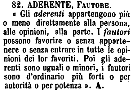 Aderente, Fautore - «Gli aderenti appartengono più o meno direttamente alla persona, alle opinioni, alla parte. I fautori possono favorire o senza appartenere o senza entrare in tutte le opinioni dei lor favoriti. Poi gli aderenti sono uguali o minori, i fautori sono d'ordinario più forti o per autorità o per potenza». A. [immagine]