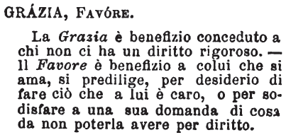 Grazia, Favore - La Grazia è benefizio conceduto a chi non ci ha un diritto rigoroso. - Il Favore è benefizio a colui che si ama, si predilige, per desiderio di fare ciò che a lui è caro, o per sodisfare a una sua domanda di cosa da non poterla avere per diritto. [immagine]