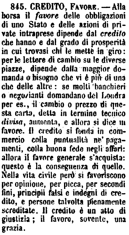 Credito, Favore - Alla borsa il favore delle obbligazioni di uno Stato e delle azioni di private intraprese dipende dal credito che hanno e dal grado di prosperità in cui trovasi chi le mette in giro: per le lettere di cambio su le diverse piazze, dipende dalla maggior domanda o bisogno che vi è più di una che delle altre: se molti banchieri o negozianti domandano del Londra per es., il cambio o prezzo di questa carta, detta in termine tecnico divisa, aumenta, e allora si dice in favore. Il credito si fonda in commercio colla puntualità ne' pagamenti, colla buona fede negli affari: allora il favore generale s'acquista: questo è la conseguenza di quello. Nella vita civile però si favoriscono per opinione, per picca, per secondi fini, principii falsi e indegni di credito, e persone talvolta pienamente screditate. Il credito è un atto di giustizia; il favore, sovente, una grazia. [immagine]