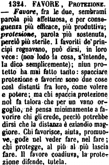 Favore, Protezione - Favore, fra le due, sembrami parola più affettuosa, e per conseguenza più efficace, più produttiva; protezione, parola più sostenuta, perciò più sterile. I favoriti de' principi regnavano, può dirsi, in loro vece: (non lodo la cosa, s'intende, la dico semplicemente); niun protetto ha mai fatto tanto: spacciare protezione e favorire sono due cose così distanti fra loro, come volere e potere; ma chi spaccia protezione nol fa talora che per un vano orgoglio, nè pensa minimamente a favorire chi gli crede, perciò potrebbe dirsi che la distanza è eziandio maggiore. Chi favorisce, aiuta, promuove, gode nel veder fare, nel fare; chi protegge, al più al più lascia fare. Il favore coadiuva, la protezione difende, tutela. [immagine]