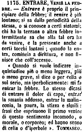 Entrare, Venir la febbre - Entrare è proprio il principiare della febbre; il venire è più lontano; si sa dalla periodicità della stessa, o si conosce a certi sintomi; chi ha la terzana o altra febbre intermittente sa che alla tal ora ha da venire, e la pressente anche a certi tocchi lontani; quando la entra, comincia a dirittura, e non finisce che coll'accesso.