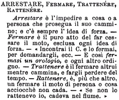 | Arrestare, Fermare, Trattenere, Rattenere - Arrestare è l'impedire a cosa o a persona che prosegua il suo cammino; e c'è sempre l'idea di forza. - Fermare è il puro atto del far cessare il moto, esclusa ogni idea di forza. - «Incontrai il C. e lo fermai, per domandargli, ecc. - E così fermasi un orologio, e ogni altro ordigno. - Trattenere è il fermare altrui mentre cammina, e fargli perdere del tempo. - Rattenere, è, più che altro, un fermare il moto di persona o cosa acciocchè non cada. - «Se non lo rattenevo io, cadeva nel fiume.» [immagine] |