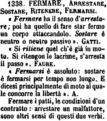 Fermare, Arrestare, Sostare, Ritenere, Fermarsi - «Fermare ha senso d'arrestare; poi ha quello di fare star fermo un corpo attaccandolo. Sostare è neutro o neutro passivo». Gatti.