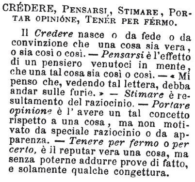 Credere, Pensarsi, Stimare, Portar opinione, Tener per fermo - Il Credere nasce o da fede o da convinzione che una cosa sia vera, o sia così o così. - Pensarsi è l'effetto di un pensiero venutoci in mente, che una tal cosa sia così o così. - «Mi penso che, vedendo tal lettera, debba andar sulle furie.» - Stimare è resultamento del raziocinio. - Portare opinione è l'avere un tal concetto rispetto a una cosa, ma non motivato da speciale raziocinio o da apparenza. - Tenere per fermo o per certo, è il reputar vera una cosa, ma senza poterne addurre prove di fatto, e solamente qualche congettura. [immagine]
