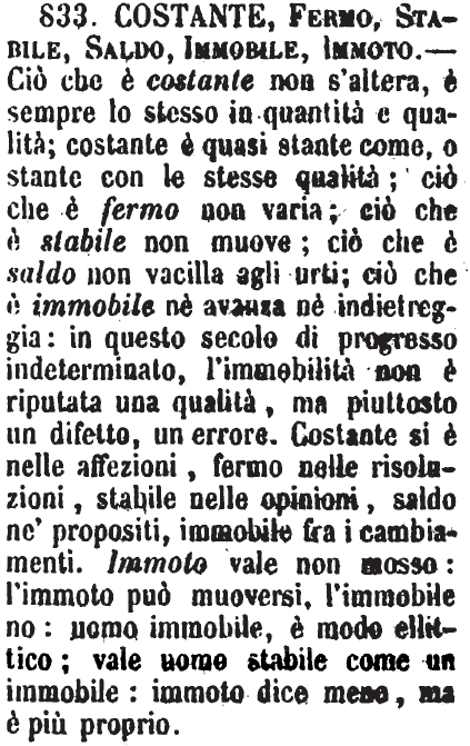 Costante, Fermo, Stabile, Saldo, Immobile, Immoto - Ciò che è costante non s'altera, è sempre lo stesso in quantità e qualità; costante è quasi stante come, o stante con le stesse qualità; ciò che è fermo non varia; ciò che è stabile non muove; ciò che è saldo non vacilla agli urti; ciò che è immobile nè avanza nè indietreggia: in questo secolo di progresso indeterminato, l'immobilità non è riputata una qualità, ma piuttosto un difetto, un errore. Costante si è nelle affezioni, fermo nelle risoluzioni, stabile nelle opinioni, saldo ne' propositi, immobile fra i cambiamenti. Immoto vale non mosso: l'immoto può muoversi, l'immobile no: uomo immobile, è modo ellittico; vale uomo stabile come un immobile: immoto dice meno, ma è più proprio. [immagine]