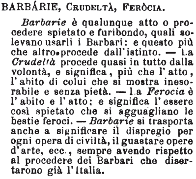 | Barbarie, Crudeltà, Ferocia - «La barbarie è nell’abitudine, la crudeltà nella voglia, la ferocia nella natura. Però diciamo: bestie feroci. Non si dirà che la bestia è barbara, perchè non può avere quelle idee e que’ sentimenti che, depravati, fanno le barbarie. Si dice che la tigre è crudele perchè uccide anche sfamata che sia. Gli animali carnivori sono tutti feroci perchè carnivori. La barbarie in alcune cose può stare con certa bontà in alcune altre. È barbaro quel selvaggio che uccide il padre; ma in altre occasioni e’ può essere umano. Barbaro non si dice che di persone; feroce, d’animali o d’atti ad animali attribuiti; crudele, e di persone e di animali e di cose». Guizot.