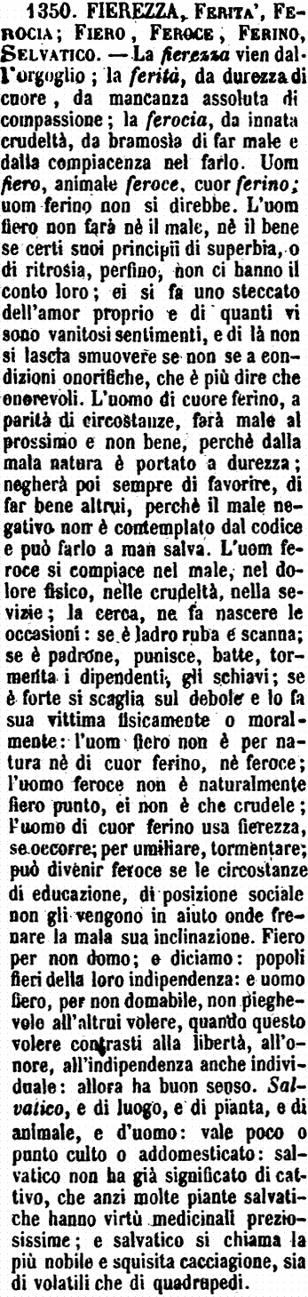 | Ferocia, Ferita, Feroce, Ferino - Tra Ferocia e Ferità c'è questo divario, che la prima è l'abito, la seconda è l'atto; ed è così delle belve, come degli uomini, spesso peggiori di esse. - Feroce è la belva e l'uomo che mette in atto la ferocia o la ferità; la qual voce ferità è però poco usata. - Ferino è qualificativo di persona che partecipa della natura della fiera. - «Ha il cuore piuttosto ferino che umano.» [immagine] |