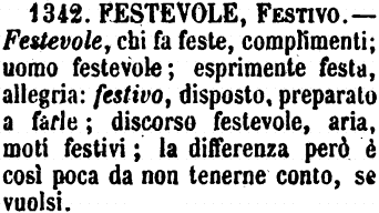 Festevole, Festivo - Festevole, chi fa feste, complimenti; uomo festevole; esprimente festa, allegria: festivo, disposto, preparato a farle; discorso festevole, aria, moti festivi; la differenza però è così poca da non tenerne conto, se vuolsi. [immagine]