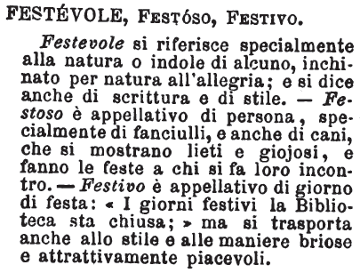 | Festevole, Festoso, Festivo - Festevole si riferisce specialmente alla natura o indole di alcuno, inchinato per natura all'allegria; e si dice anche di scrittura e di stile, - Festoso è appellativo di persona, specialmente di fanciulli, e anche di cani, che si mostrano lieti e giojosi, e fanno le feste a chi si fa loro incontro. - Festivo è appellativo di giorno di festa: «I giorni festivi la Biblioteca sta chiusa;» ma si trasporta anche allo stile e alle maniere briose e attrattivamente piacevoli. [immagine] |