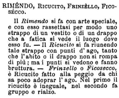 Rimendo, Ricucito, Frinzello, Ficosecco - Il Rimendo si fa con arte speciale, e con esso rassettasi per modo uno strappo di un vestito o di un drappo che a fatica si vede il luogo dove esso fu. - Il Ricucito si fa riunendo tale strappo con punti d'ago, tanto che l'abito o il drappo non si rompa di più; ma i punti si vedono e fanno bruttura. - Frinzello o Ficosecco, è Ricucito fatto alla peggio da chi sa poco adoprar l'ago. Nel primo il ricucito è ineguale, nel secondo fa gruppo e rialzo. [immagine]