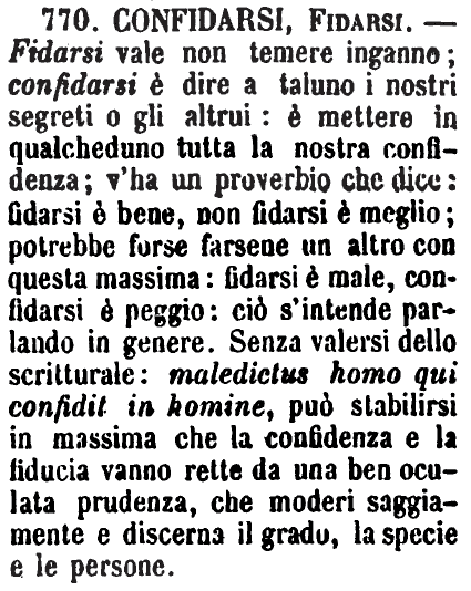| Confidarsi, Fidarsi, Affidarsi - Confidarsi è dire a taluno le cose più intime e più segrete per averne conforto o consiglio, è mettere in alcuno tutta la nostra confidenza, sperando che l'amico non rivelerà. - Fidarsi è il trattare con altri i più gravi negozii d'interessi o di altro, senza pigliare nessuna sicurtà, non dubitando di poter essere ingannato. - Confidarsi e Fidarsi sono ottime cose; ma si avverte di governarle con la prudenza, ricordando per questo il proverbio: «Fìdati era un brav'uomo; ma Non-ti-fidare era più bravo di lui:» e per l'altro la sentenza della Scrittura: «Maledictus homo qui confidit in homine. - » [Affidarsi è interamente rimettersi e quasi dare sè stesso a persona di cui ci fidiamo. G. F.] [immagine] |