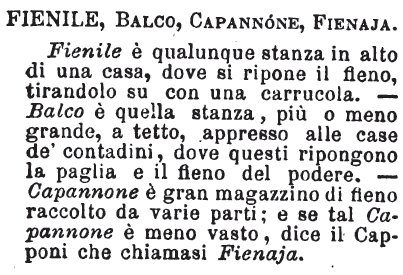 Fienile, Balco, Capannone, Fienaja - Fienile è qualunque stanza in alto di una casa, dove si ripone il fieno, tirandolo su con una carrucola. - Balco è quella stanza, più o meno grande, a tetto, appresso alle case de' contadini, dove questi ripongono la paglia e il fieno del podere. - Capannone è gran magazzino di fieno raccolto da varie parti; e se tal Capannone è meno vasto, dice il Capponi che chiamasi Fienaja. [immagine]