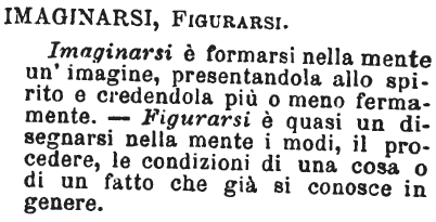 Imaginarsi, Figurarsi - Imaginarsi è formarsi nella mente un'imagine, presentandola allo spirito e credendola più o meno fermamente. - Figurarsi è quasi un disegnarsi nella mente i modi, il procedere, le condizioni di una cosa o di un fatto che già si conosce in genere. [immagine]