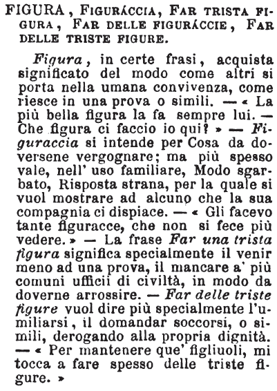 Figura, Figuraccia, Far trista figura, Far delle figuraccie, Far delle triste figure - Figura, in certe frasi, acquista significato del modo come altri si porta nella umana convivenza, come riesce in una prova o simili. - «La più bella figura la fa sempre lui. - Che figura ci faccio io qui?» - Figuraccia si intende per Cosa da doversene vergognare; ma più spesso vale, nell'uso familiare, Modo sgarbato, Risposta strana, per la quale si vuol mostrare ad alcuno che la sua compagnia ci dispiace. - «Gli facevo tante figuracce, che non si fece più vedere.» - La frase Far una trista figura significa specialmente il venir meno ad una prova, il mancare a' più comuni ufficii di civiltà, in modo da doverne arrossire. - Far delle triste figure vuol dire più specialmente l'umiliarsi, il domandar soccorsi, o simili, derogando alla propria dignità. - «Per mantenere que' figliuoli, mi tocca a fare spesso delle triste figure.» [immagine]