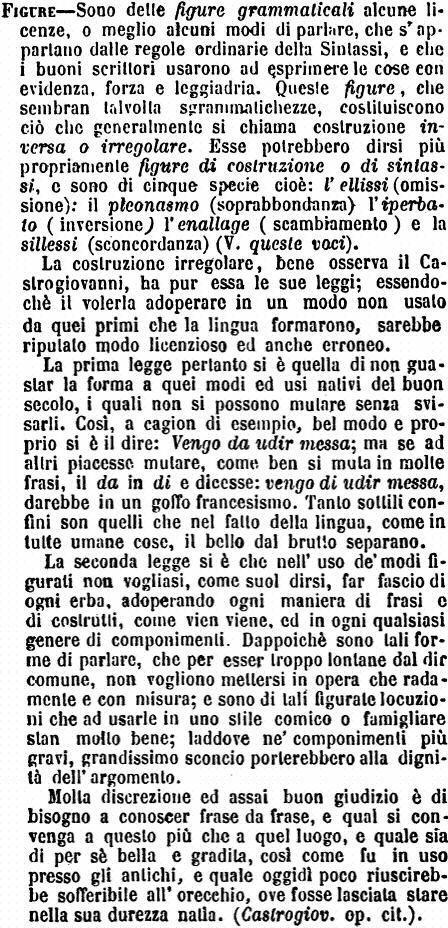 Figure - Sono dette figure grammaticali alcune licenze, o meglio alcuni modi di parlare, che s'appartano dalle regole ordinarie della Sintassi, e che i buoni scrittori usarono ad esprimere le cose con evidenza, forza e leggiadria. Queste figure, che sembran talvolta sgrammatichezze, costituiscono ciò che generalmente si chiama costruzione inversa o irregolare. Esse potrebbero dirsi più propriamente figure di costruzione o di sintassi, e sono di cinque specie cioè: l'ellissi (omissione): il pleonasmo (soprabbondanza) l'iperbato (inversione) l'enallage (scambiamento) e la sillessi (sconcordanza) (V. queste voci).