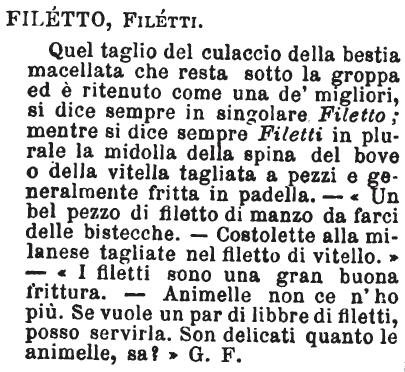| Filetto, Filetti - Quel taglio del culaccio della bestia macellata che resta sotto la groppa ed è ritenuto come una de' migliori, si dice sempre in singolare Filetto; mentre si dice sempre Filetti in plurale la midolla della spina del bove o della vitella tagliata a pezzi e generalmente fritta in padella. - «Un bel pezzo di filetto di manzo da farci delle bistecche. - Costolette alla milanese tagliate nel filetto di vitello.» - «I filetti sono una gran buona frittura. - Animelle non ce n'ho più. Se vuole un par di libbre di filetti, posso servirla. Son delicati quanto le animelle, sa?» G. F. [immagine] |