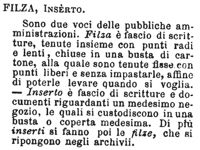 | Filza, Inserto - Sono due voci delle pubbliche amministrazioni. Filza è fascio di scritture, tenute insieme con punti radi e lenti, chiuse in una busta di cartone, alla quale sono tenute fisse con punti liberi e senza impastarle, affine di poterle levare quando si voglia. - Inserto è fascio di scritture e documenti riguardanti un medesimo negozio, le quali si custodiscono in una busta o coperta medesima. Di più inserti si fanno poi le filze, che si ripongono negli archivii. [immagine] |