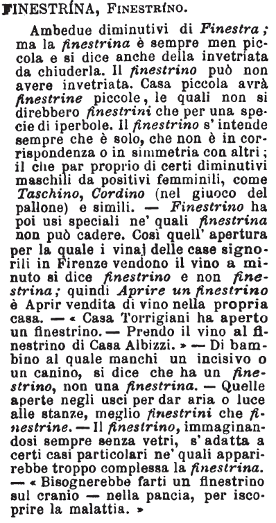 Finestrina, Finestrino - Ambedue diminutivi di Finestra; ma la finestrina è sempre men piccola e si dice anche della invetriata da chiuderla. Il finestrino può non avere invetriata. Casa piccola avrà finestrine piccole, le quali non si direbbero finestrini che per una specie di iperbole. Il finestrino s'intende sempre che è solo, che non è in corrispondenza o in simmetria con altri; il che par proprio di certi diminutivi maschili da positivi femminili, come Taschino, Cordino (nel giuoco del pallone) e simili. - Finestrino ha poi usi speciali ne' quali finestrina non può cadere. Così quell'apertura per la quale i vinaj delle case signorili in Firenze vendono il vino a minuto si dice finestrino e non finestrina; quindi Aprire un finestrino è Aprir vendita di vino nella propria casa. - « Casa Torrigiani ha aperto un finestrino. - Prendo il vino al finestrino di Casa Albizzi. » - Di bambino al quale manchi un incisivo o un canino, si dice che ha un finestrino, non una finestrina. - Quelle aperte negli usci per dar aria o luce alle stanze, meglio finestrini che finestrine. - Il finestrino, immaginandosi sempre senza vetri, s'adatta a certi casi particolari ne' quali apparirebbe troppo complessa la finestrina. - « Bisognerebbe farti un finestrino sul cranio - nella pancia, per iscoprire la malattia. » [immagine]