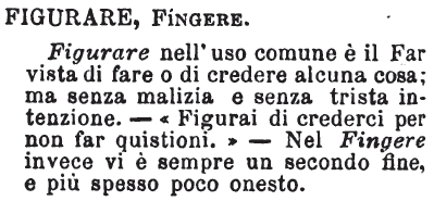 Figurare, Fingere - Figurare nell'uso comune è il Far vista di fare o di credere alcuna cosa; ma senza malizia e senza trista intenzione. - « Figurai di crederci per non far quistioni.» - Nel Fingere invece vi è sempre un secondo fine, e più spesso poco onesto. [immagine]