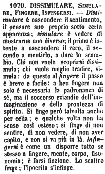 Dissimulare, Simulare, Fingere, Infingersi - Dissimulare è nascondere il sentimento, il pensare suo proprio sotto certa apparenza; simulare è vedere di mostrarne uno diverso; il primo è intento a nascondere il vero, il secondo a mentirlo, a dare lo scambio. Chi non vuole scoprirsi dissimula; chi vuole meglio tradire, simula: da questo al fingere il passo è breve e facile: a ben fingere non solo è necessaria la padronanza di sé, ma il soccorso eziandio dell'immaginazione e della prontezza di spirito. Si finge però talvolta anche per celia; e qualche volta non ha senso così esteso; si finge di non sentire, di non vedere, di non aver capito, e non si va più in là. Infingersi è come un disporre tutto se stesso a fingere, mente, corpo, fisonomia; è farsi finzione. Lo scaltro finge; l'ipocrita s'infinge. [immagine]
