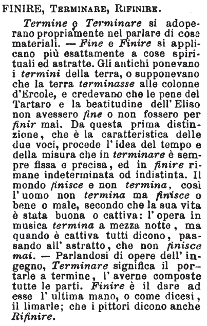 Finire, Terminare, Rifinire - Termine e Terminare si adoperano propriamente nel parlare di cose materiali. - Fine e Finire si applicano più esattamente a cose spirituali ed astratte. Gli antichi ponevano i termini della terra, o supponevano che la terra terminasse alle colonne d'Ercole, e credevano che le pene del Tartaro e la beatitudine dell'Eliso non avessero fine o non fossero per finir mai. Da questa prima distinzione, che è la caratteristica delle due voci, procede l'idea del tempo e della misura che in terminare è sempre fissa e precisa, ed in finire rimane indeterminata od indistinta. Il mondo finisce e non termina, così l'uomo non termina ma finisce o bene o male, secondo che la sua vita è stata buona o cattiva: l'opera in musica termina a mezza notte, ma quando è cattiva tutti dicono, passando all'astratto, che non finisce mai. - Parlandosi di opere dell'ingegno, Terminare significa il portarle a termine, l'averne composte tutte le parti. Finire è il dare ad esse l'ultima mano, o come dicesi, il limarle; che i pittori dicono anche Rifinire. [immagine]