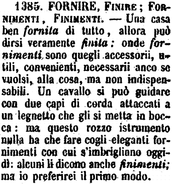 Fornire, Finire; Fornimenti, Finimenti - Una casa ben fornita di tutto, allora può dirsi veramente finita: onde fornimenti sono quegli accessorii, utili, convenienti, necessarii anco se vuolsi, alla cosa, ma non indispensabili. Un cavallo si può guidare con due capi di corda attaccati a un legnetto ch gli si metta in bocca: ma questo rozzo istrumento nulla ha che fare cogli eleganti fornimenti con cui s'imbrigliano oggidì: alcuni li dicono anche finimenti; ma io preferirei il primo modo. [immagine]