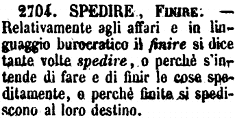 Spedire, Finire - Relativamente agli affari e in linguaggio burocratico il finire si dice tante volte spedire, o perchè s'intende di fare e di finir le cose speditamente, e perchè finita si spediscono al loro destino. [immagine]