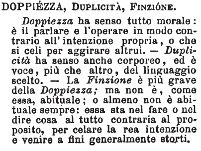 | Doppiezza, Duplicità, Finzione - Doppiezza ha senso tutto morale: è il parlare e l'operare in modo contrario all'intenzione propria, o che si celi per aggirare altrui. - Duplicità ha senso anche corporeo, ed è voce, più che altro, del linguaggio scelto. - La Finzione è piu grave della Doppiezza; ma non è, come essa, abituale; o almeno non è abituale sempre: essa sta nel fare o nel dire cosa al tutto contraria al proposito, per celare la rea intenzione e venire a fini generalmente storti. [immagine] |