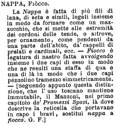| Nappa, Fiocco - La Nappa è fatta di più fili di lana, di seta e simili, legati insieme in modo da formare come un mazzocchio, che si mette alle estremità dei cordoni delle tende, o altrove, per ornamento, come pendenti da una parte dell'abito, da' cappelli di prelati e cardinali, ecc. - Fiocco è legatura di nastro fatta avvolgendo insieme i due capi di esso in modo che ne resulti una staffa di qua e una di là in modo che i due capi penzolino tramezzo simmetricamente. - [Seguendo appunto questa distinzione, che l'uso toscano mantiene immutabile, il Manzoni, nel primo capitolo de' Promessi Sposi, là dove descrive la reticella che portavano in capo i bravi, sostituì nappa a fiocco. G. F.] [immagine] |