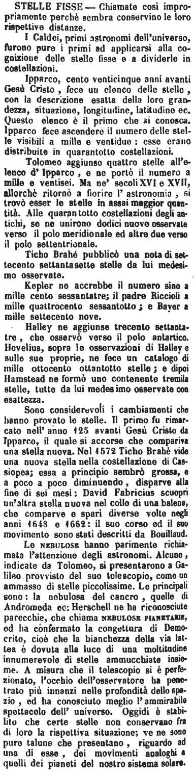 I Caldei, primi astronomi dell’universo, furono pure i primi ad applicarsi alla cognizione delle stelle fise e a dividerle in costellazioni. Ipparco, cento venticinque anni avanti Gesù Cristo, fece un elenco delle stelle, con la descrizione esatta della loro grandezza, situazione, longitudine, latitudine ec. Questo elenco è il primo che si conosca. Ipparco fece ascendere il numero delle stelle visibili a mille e ventidue: esse erano distribuite in quarantotto costellazioni. Tolomeo aggiunse quattro stelle all’elenco d’Ipparco, e ne portò il numero a mille e ventisei. Ma ne’ secoli XVI e XVII, allorchè ritornò a fiorire l’astronomia, si trovò esser le stelle in assai maggior quantità. Alle quarantotto costellazioni degli antichi, se ne unirono dodici nuove osservate verso il polo meridionale ed altre due verso il polo settentrionale. Ticho Brahé pubblicò una nota di settecento settantasette stelle da lui medesimo osservate. Kepler ne accrebbe il numero sino a mille cento sessantatre; il padre Riccioli a mille quattrocento sessantotto; e Bayer a mille settecento nove. Halley ne aggiunse trecento settantatre, che osservò verso il polo antartico. Hevelius, sopra le osservazioni di Halley e sulle sue proprie, ne fece un catalogo di mille ottocento ottantotto stelle; e dipoi Hamstead ne formò uno contenente tremila stelle, tutte da lui medesimo osservate con esattezza. Sono considerevoli i cambiamenti che hanno provato le stelle. Il primo fu rimarcato nell’anno 125 avanti Gesù Cristo da Ipparco, il quale si accorse che compariva una stella nuova. Nel 1572 Ticho Brahè vide una nuova stella nella costellazione di Cassiopea; essa a principio sembrò grossa, e a poco a poco diminuendo, disparve alla fine di sei mesi: David Fabricius scuoprì un’altra stella nuova nel collo di una balena, che comparve e sparì diverse volte negli anni 1648 e 1662: il suo corso ed il suo movimento sono stati descritti da Bouillaud. Le nebulose hanno parimente richiamata l’attenzione degli astronomi. Alcune, indicate da Tolomeo, si presentarono a Galileo provvisto del suo telescopio, come un ammasso di stelle piccolissime. Le principali sono: la nebulosa del cancro, quelle di Andromeda ec: Herschell ne ha riconosciute parecchie, che chiama nebulose pianetarie, ed ha confermato la congettura di Democrito, cioè che la bianchezza della via lattea è dovuta alla luce di una moltitudine innumerevole di stelle ammucchiate insieme. A misura che il telescopio si è perfezionato, l’occhio dell’osservatore ha penetrato più innanzi nelle profondità dello spazio, ed ha conosciuto meglio l’ammirabile spettacolo dell’universo. Oggidì è stabilito che certe stelle non conservano fra di loro la rispettiva situazione; ve ne sono pure talune che presentano, riguardo ad una di esse, dei movimenti analoghi a quelli dei pianeti del nostro sistema solare. [immagine] |