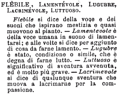 | Flebile, Lamentevole, Lugubre, Lacrimevole, Luttuoso - Flebile si dice dlela voce e dei suoni che ispirano mestizia e quasi muovono al pianto. - Lamentevole è della voce umana in suono di lamentarsi; e alle volte si dice per aggiunto di cosa da farne lamento. - Lugubre è stato, condizione o simile, che è degna di farne lutto. - Luttuoso è significativo di sventura avvenuta, ed è molto più grave. - Lacrimevole si dice di qualunque sventura che muova a lacrimarne per la compassione. [immagine] |