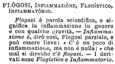 | Flogosi, Infiammazione, Flogistico, Infiammatorio - Flogosi è parola scientifica, e significa la infiammazione in genere e con qualche gravità. - Infiammazione è, dirò così, Flogosi parziale, e può essere lieve: « C' è un poco di infiammazione, ma non è nulla;» che mal si direbbe c'è flogosi. - I derivati sono Flogistico e Infiammatorio. [immagine] |